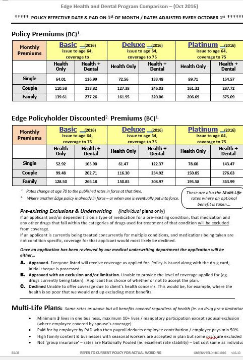 Stand Alone Policy Premiums (BC) and Multi-Life Plans